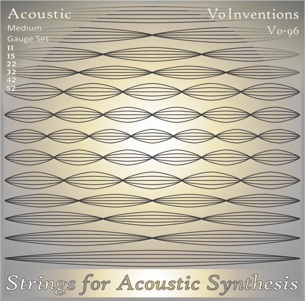 Acoustic Synthesis Strings have magnetic properties that are optimized for electromagnetic control of vibration and timbre. They are designed to look, feel and sound like a good set of standard acoustic guitar strings. The wound strings incorporate iron alloys and silver to achieve the special properties. Long lasting, their tone mellows very gradually with age.
